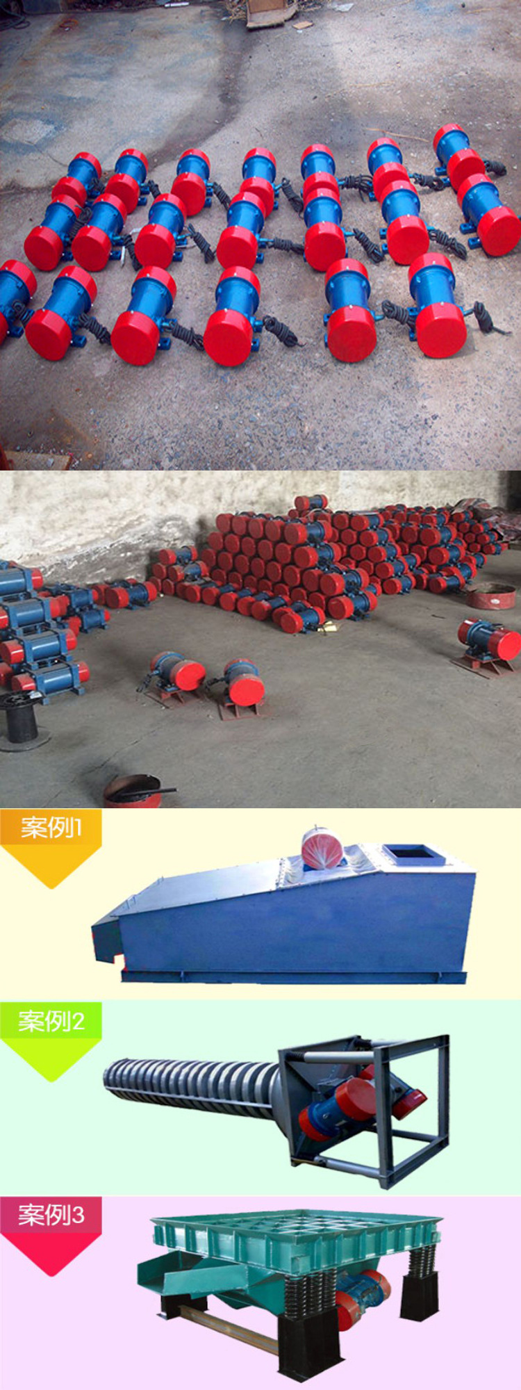 它使用于料倉、料斗、溜槽的倉壁振動,還是自同步直線振動篩、振動給料機、振動輸送機等各種振動機械的理想激振源,是電力、冶金、礦山、煤炭、建材、化工等行業的必備設備,有廣泛的應用范圍。