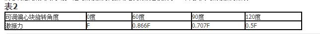 振動電機每端出軸均有一個固定偏心塊和一個可調偏心塊,調節可調偏心塊和固定偏心塊之間的夾角可改變激振力的大小。出廠時可調偏心塊和固定偏心塊之間的夾角為0度,這時的激振力為振動電機的額定激振力F,不同夾角時的激振力如表2。